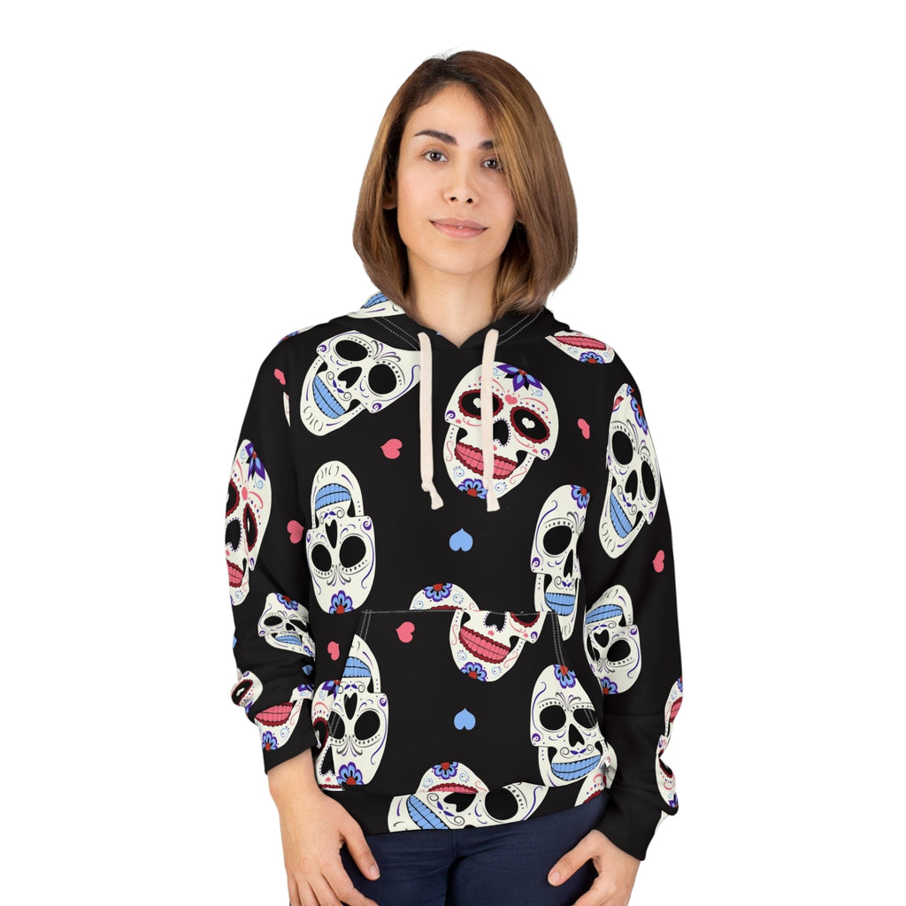 Celebrate the spirit of Día de Muertos with this striking hoodie featuring vibrant sugar skull imagery in electric reds, blues, and soft pinks against a rich black canvas. The eye-catching all-over print delivers instant visual impact while the practical kangaroo pocket and adjustable drawstring hood keep you comfortable during evening outings, festivals, or relaxed nights in. Crafted from medium-weight polyester, this piece resists fading and dries quickly without sacrificing warmth. Perfect for those who embrace bold artistic expression, this hoodie transforms any casual outfit into a conversation starter—whether you're navigating city streets, attending cultural celebrations, or simply making a statement about your distinctive style.