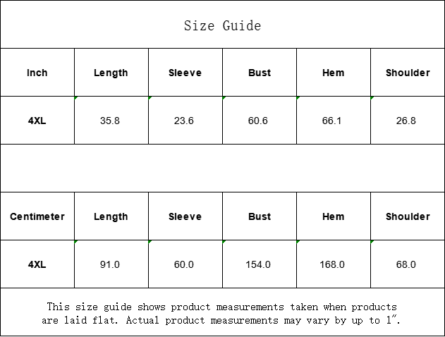 | Inch | Length | Sleeve | Bust | Hem | Shoulder |