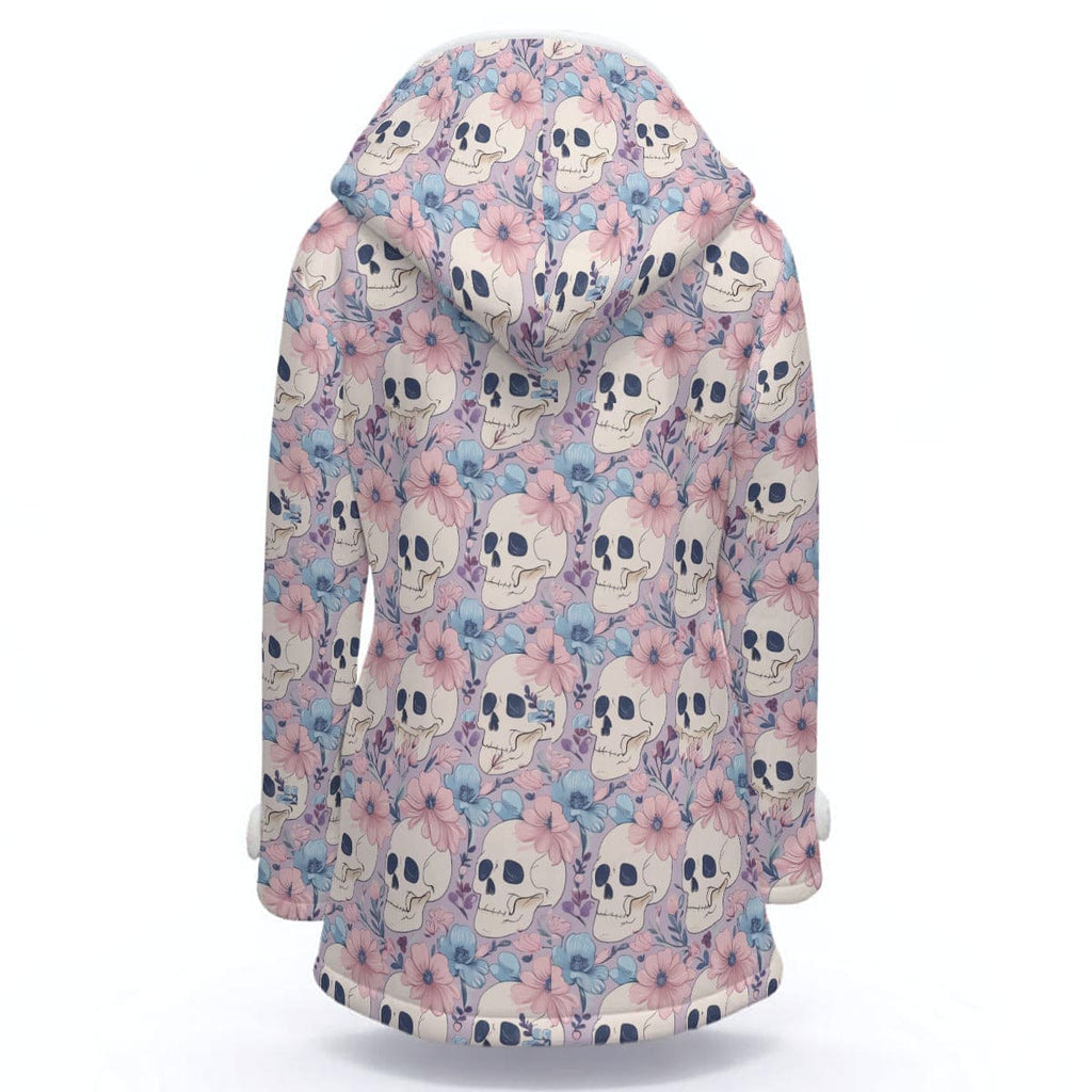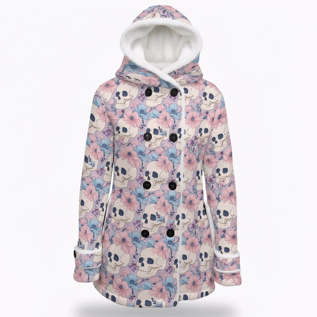 Women's Pastel Skulls Floral Hooded Double-Breasted Winter Coat With Fleece