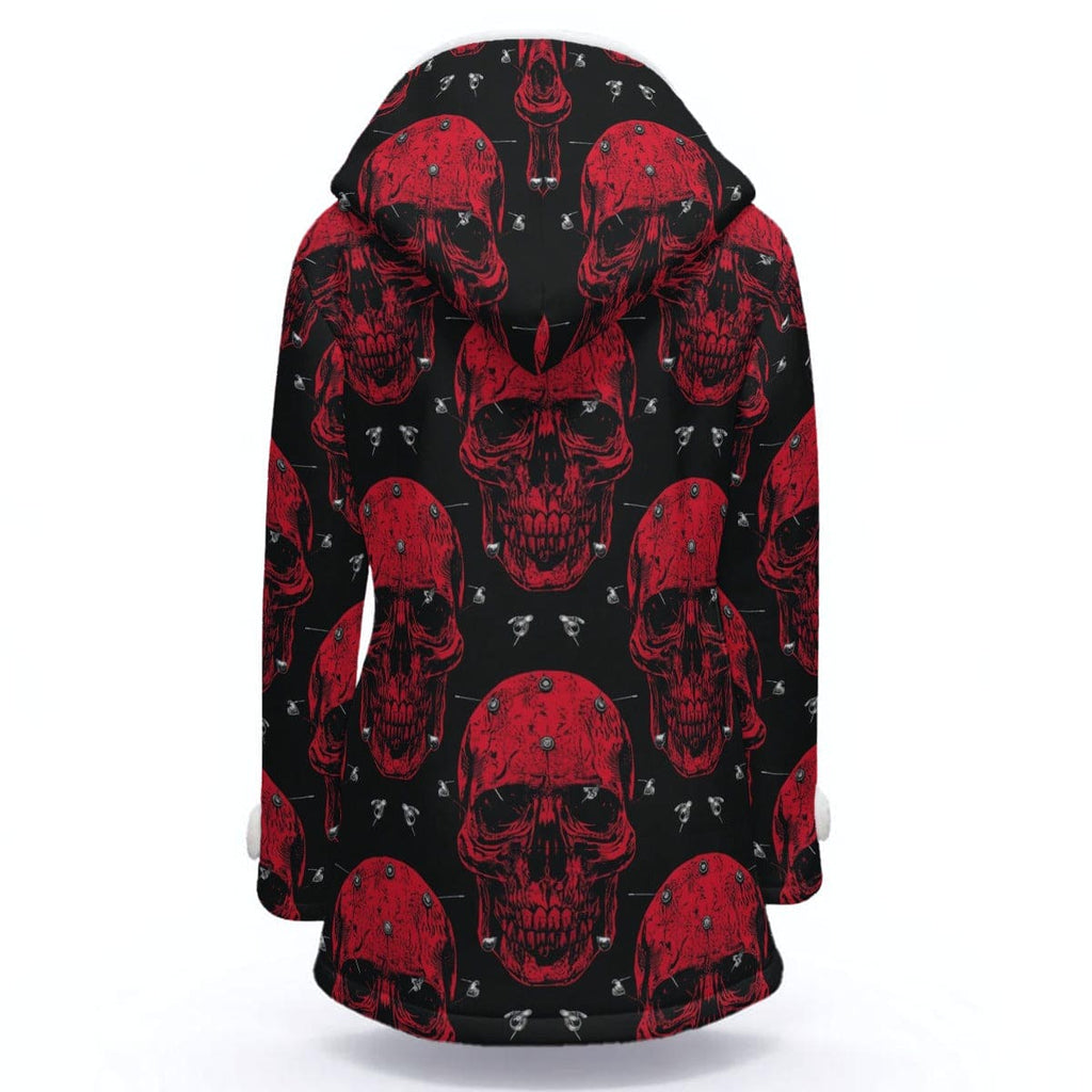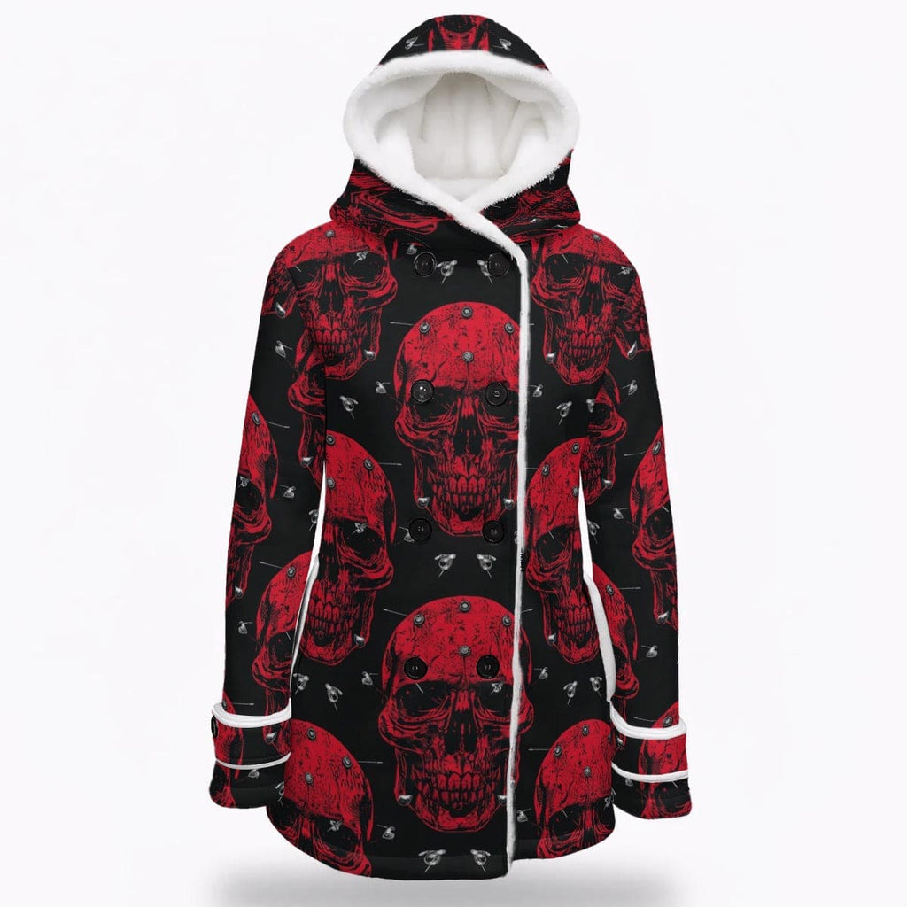 Women's Red Skulls Hooded Double-Breasted Winter Coat With Fleece