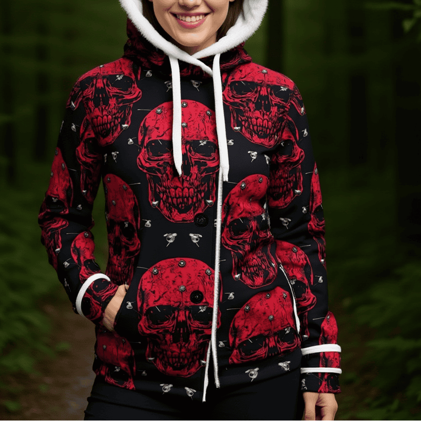 Embrace winter in bold style with this striking red skulls hooded coat. The double-breasted silhouette and contrasting black buttons deliver timeless sophistication, while the plush fleece lining wraps you in warmth from collar to hem. A generously padded hood shields you from harsh weather without compromising on elegance. Whether you're navigating city streets or enjoying weekend adventures, this versatile mid-length coat adapts to your lifestyle while flattering your figure. Experience the perfect fusion of edgy design and cozy comfort that keeps you looking sharp all season long.
