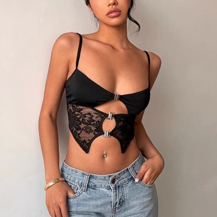 Turn heads in this sultry black top, featuring intricate lace patchwork, bold strappy details, and a flattering silhouette that hugs in all the right places. Whether you’re channeling goth glam or just love edgy elegance, this top is your go-to for night outs, concerts, and statement street style.