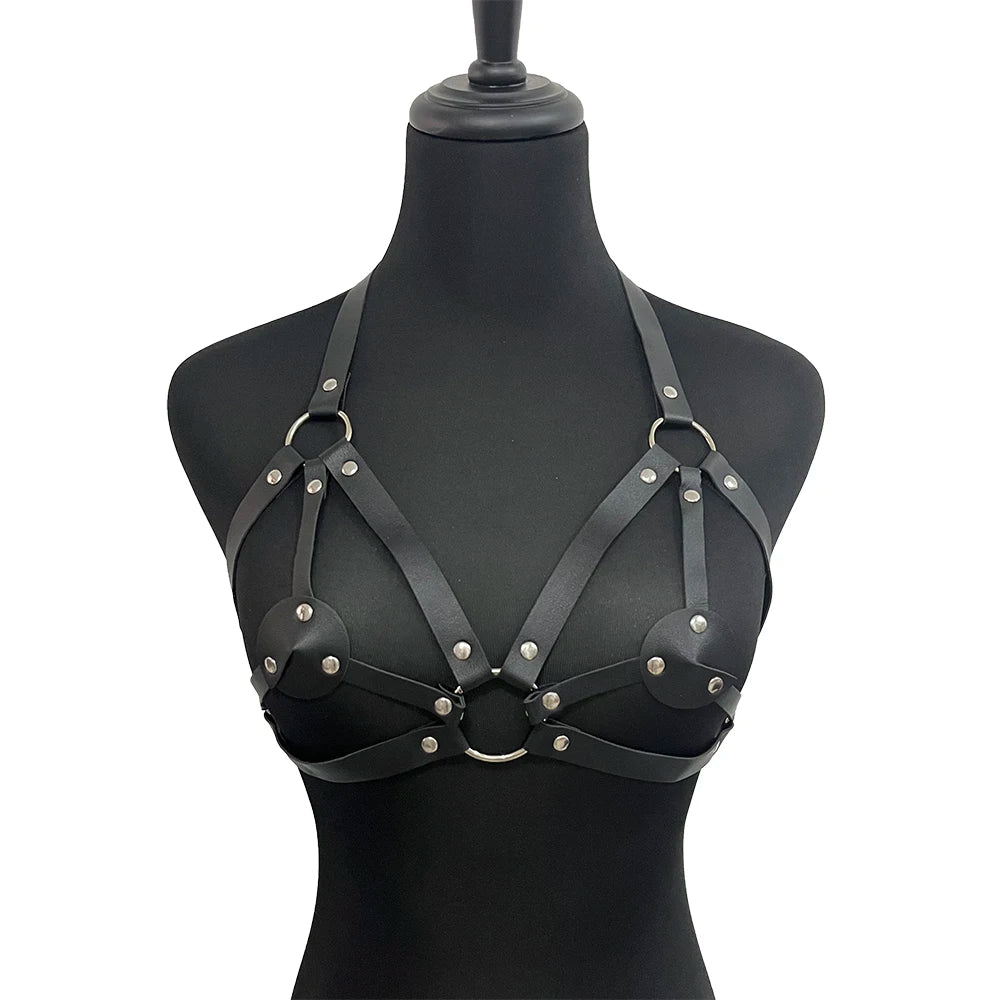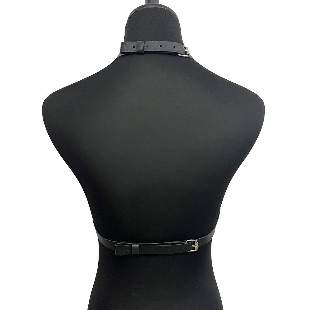 This women's chest harness cage bra combines synthetic leather and metal for a bold, gothic-inspired look. Designed specifically for women, it offers a striking accessory to elevate your edgy style.