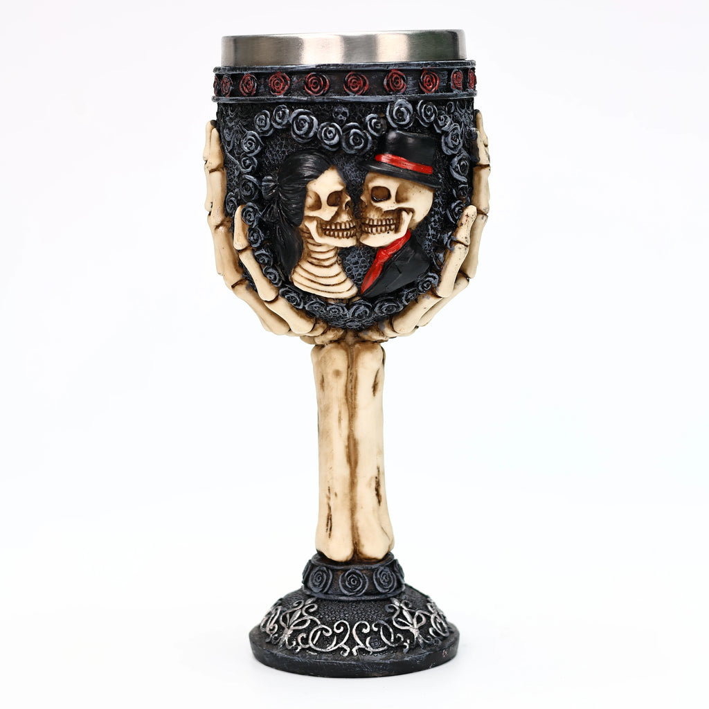 3. The faces of the bride and groom are engraved on both sides of this wine glass, who are dressed in Gothic wedding costumes. The skull is surrounded by a rose wreath scroll that surrounds the cup surface. The top of the chalice is supported by two skeleton hands.