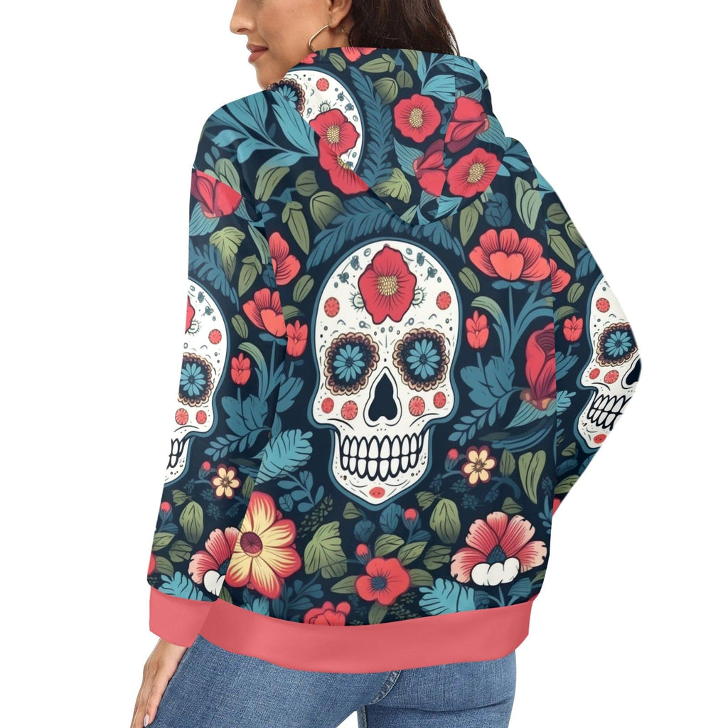Blue Red Floral Skulls Women's Zip Up Hoodie