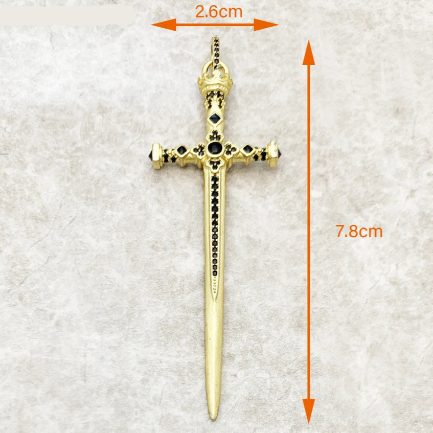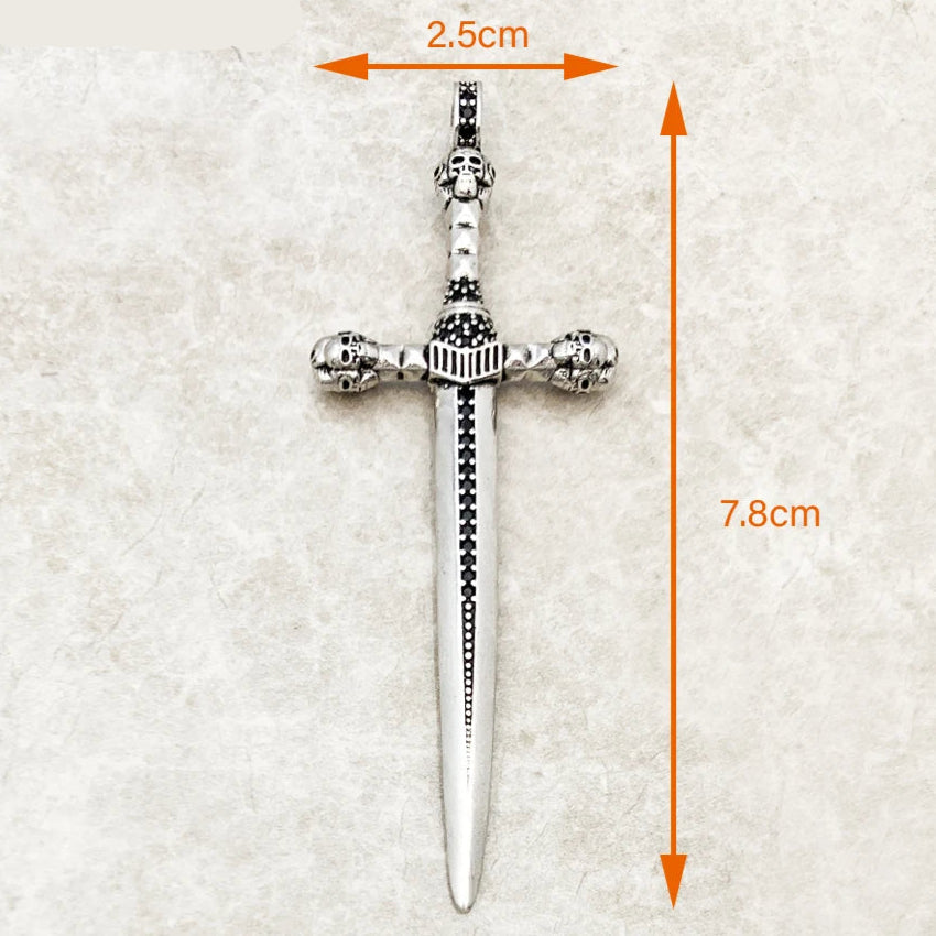 This vintage-style pendant features a sterling silver sword crowned with a skull, weighing 12.4g and measuring 6.6x1.9cm. Crafted from 925 sterling silver and adorned with zircon, it comes with a CNAS certificate (No. 35210535301), ensuring its fine quality. Perfect for adding a bold, timeless touch to your necklace collection.