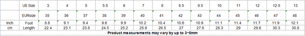 | EUR Size | US Size | Insole Length(inch) | Insole Length(mm) |