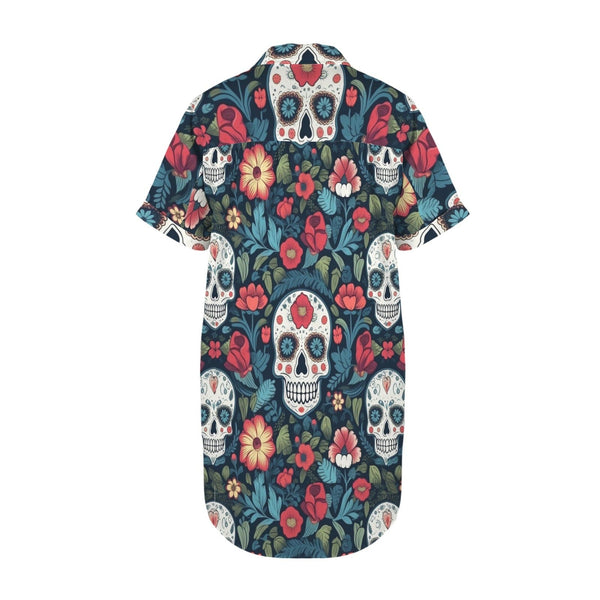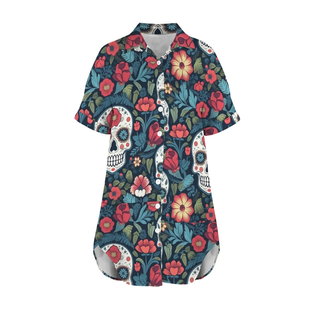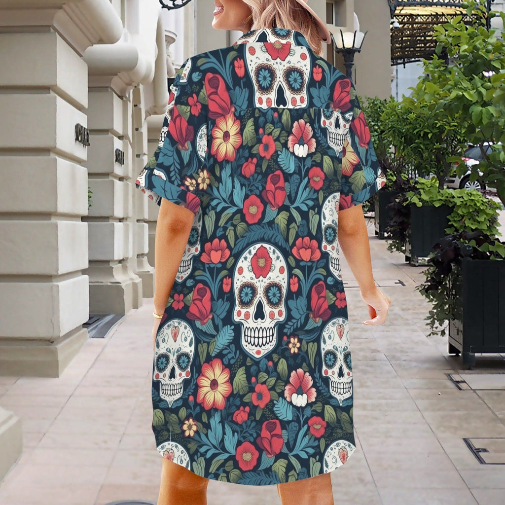 Skull Tropical Floral Short Sleeve Button Down Shirt Dress