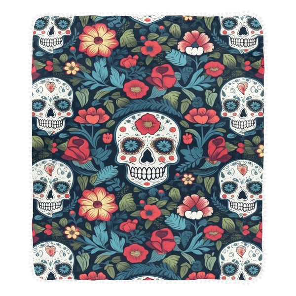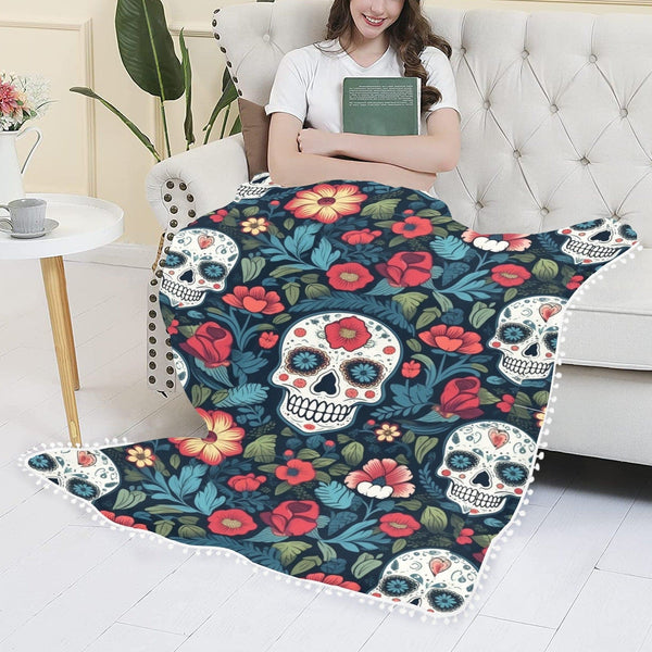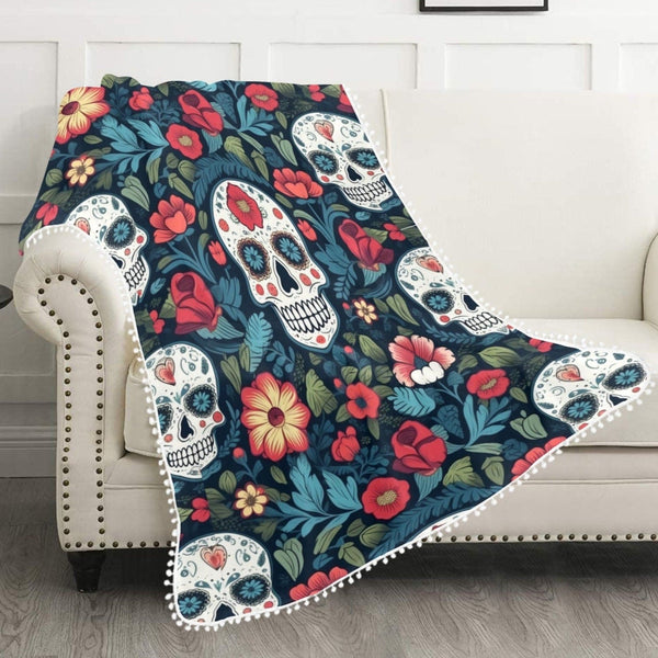 Skulls Blue & Red Floral Pom Pom Fringe Blanket 60"x80"