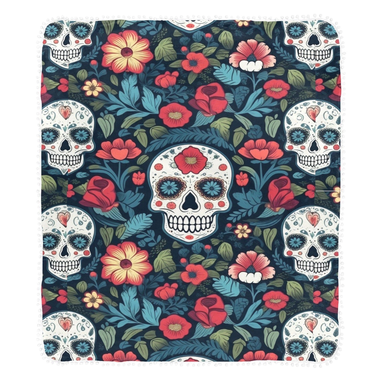 Wrap yourself in the cozy comfort of this 60"x80" blanket, crafted from ultra-soft flannel with vibrant blue and red floral skull designs. The playful pom pom fringe adds a stylish touch, making it perfect for adding warmth and personality to any space.m pom fringe around the edge, the custom blanket gives your decor a cozy and chic style.