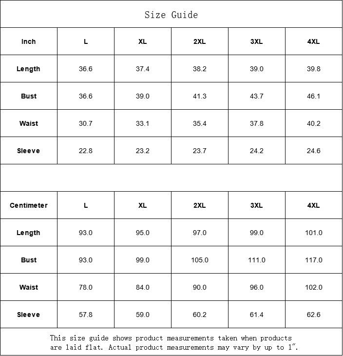 | Centimeter | L | XL | 2XL | 3XL | 4XL |