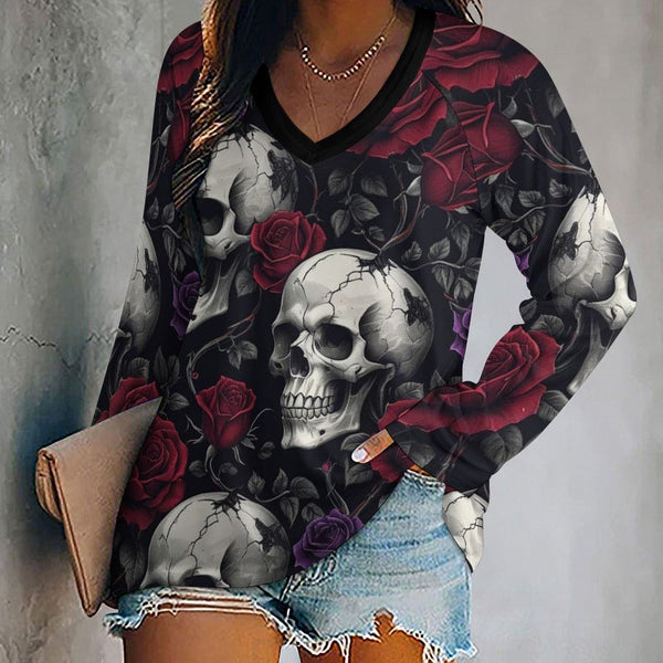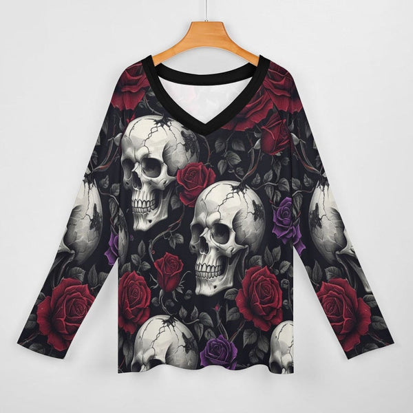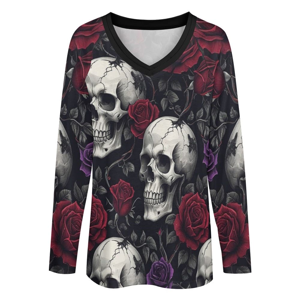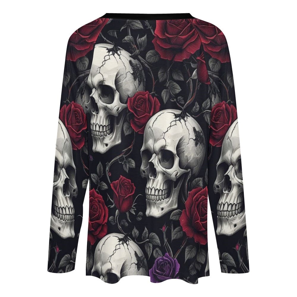 Women's Dark Skull Red Roses Long Sleeve T-Shirt
