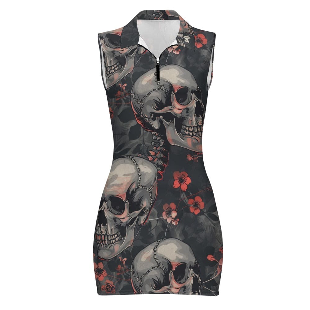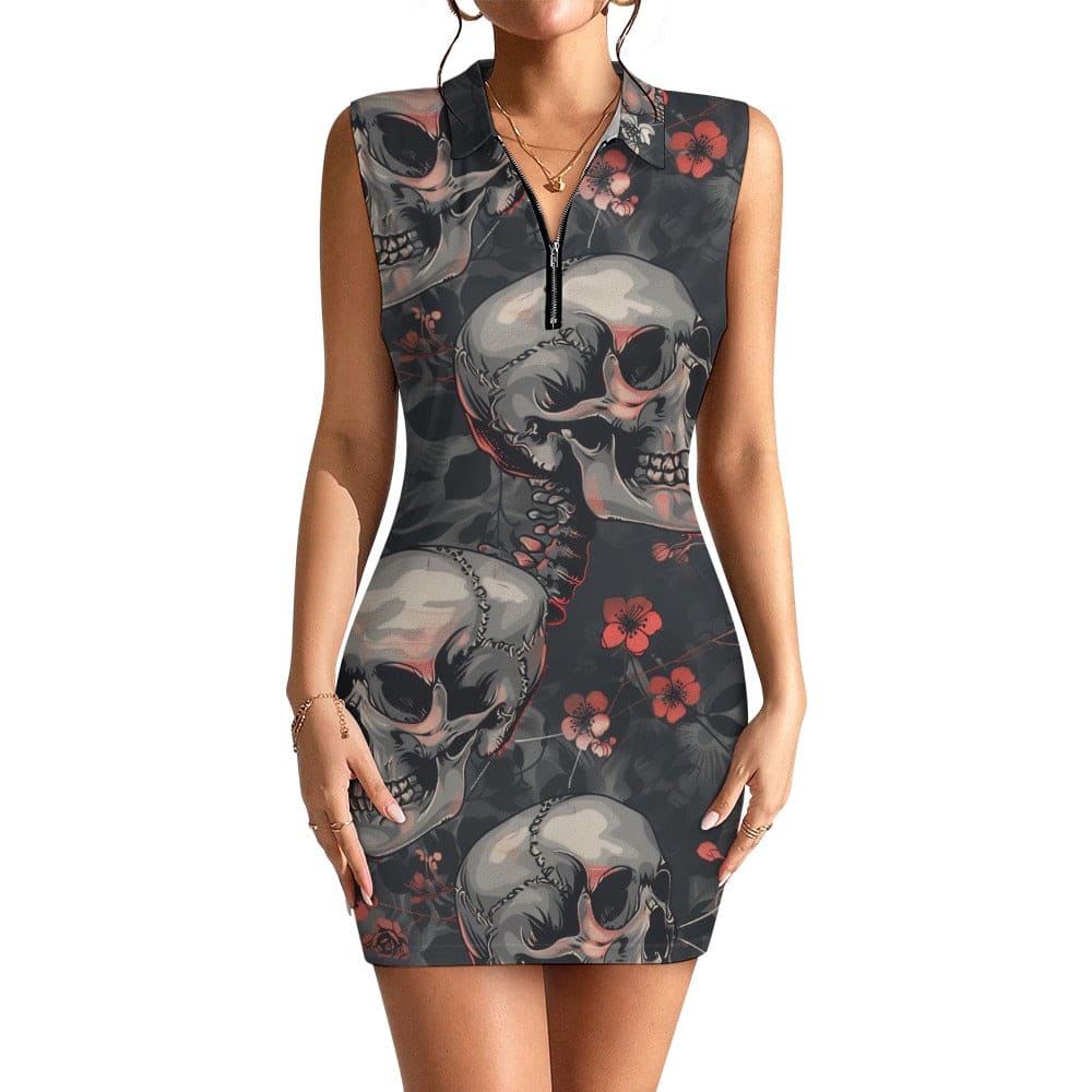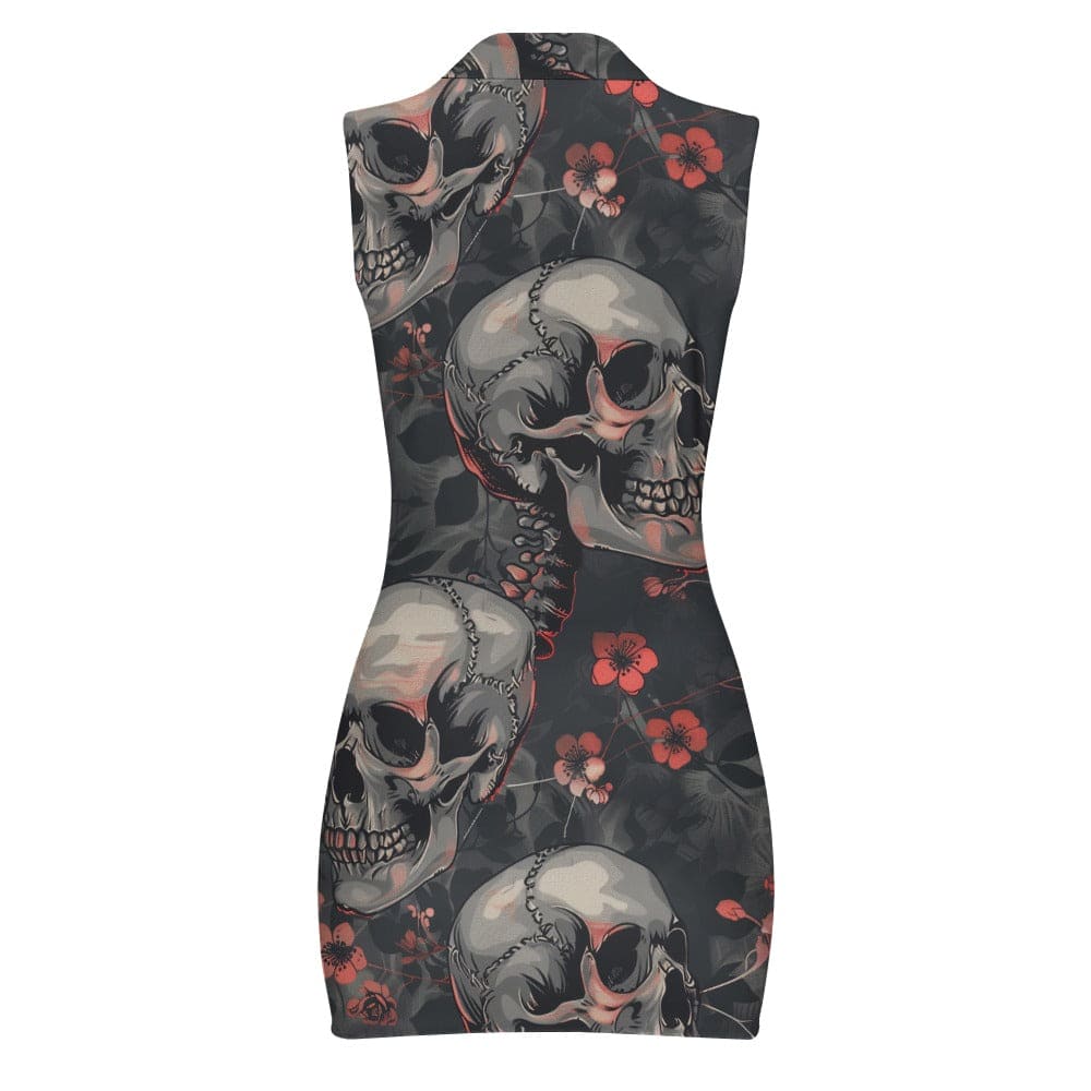 Women's Gray Skulls Red Floral Short Sleeve Dress with Zipper