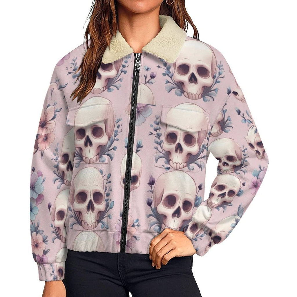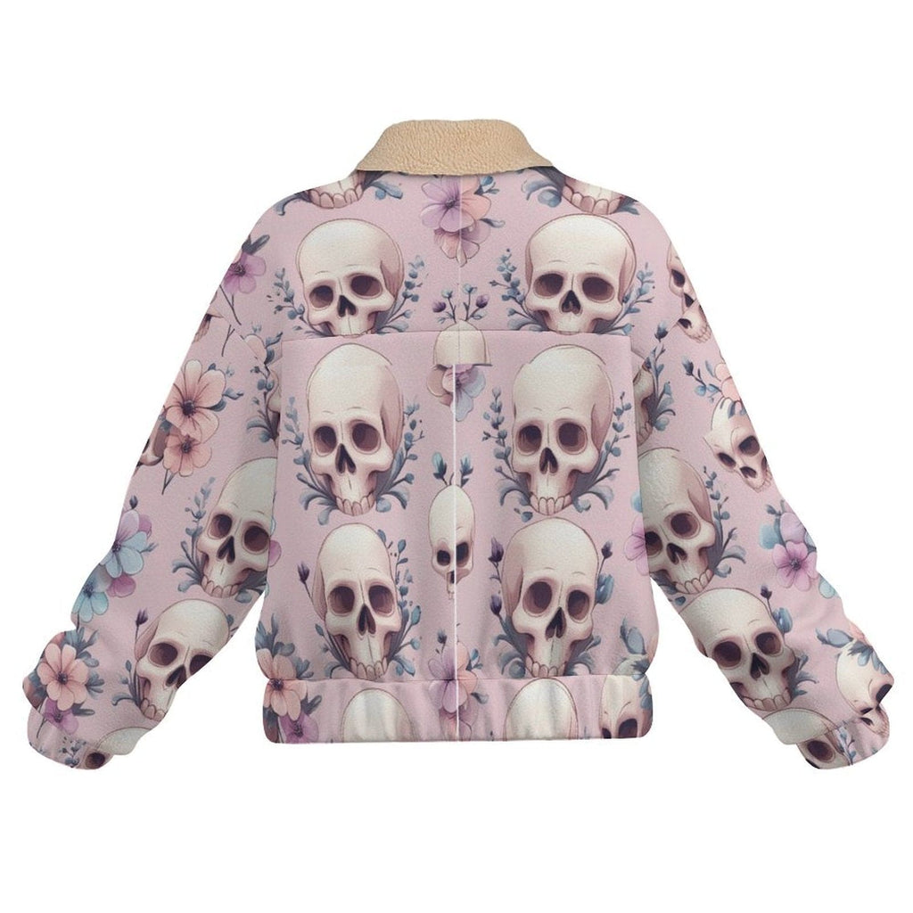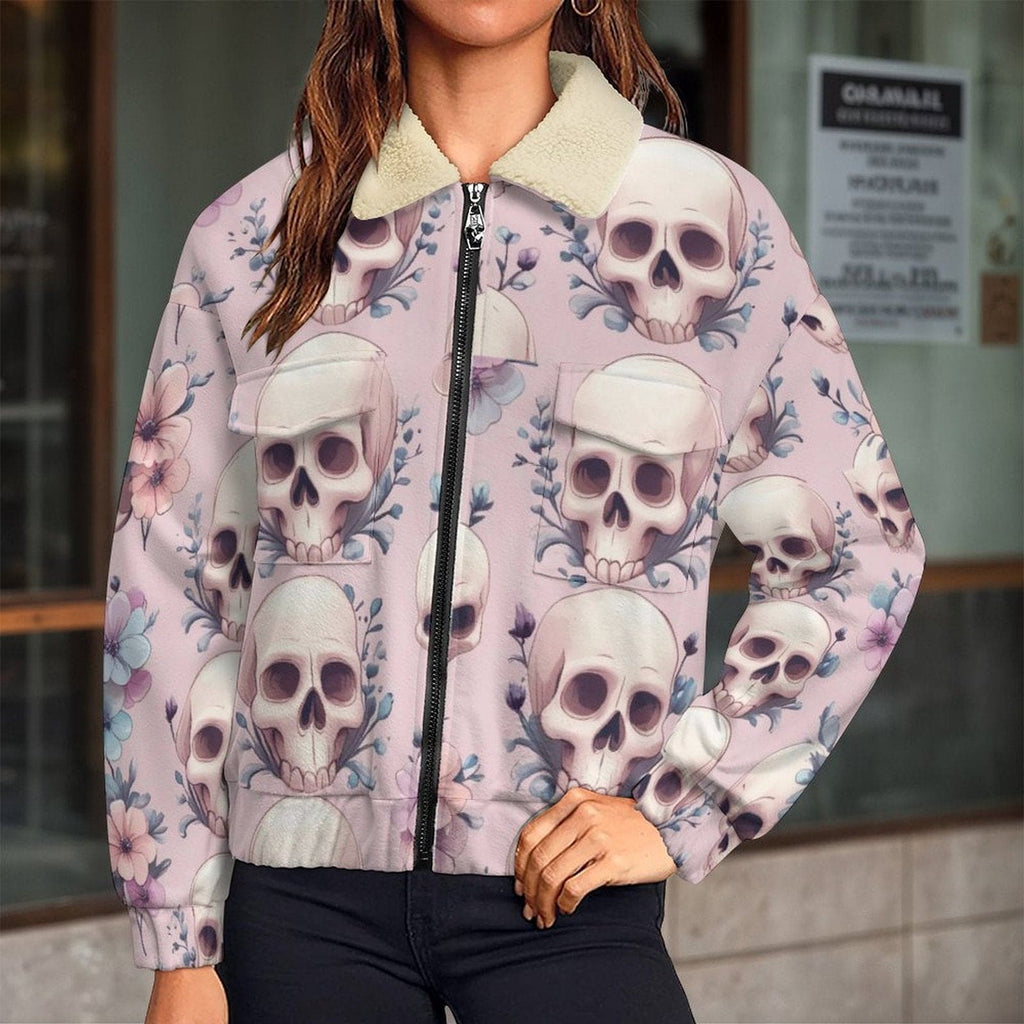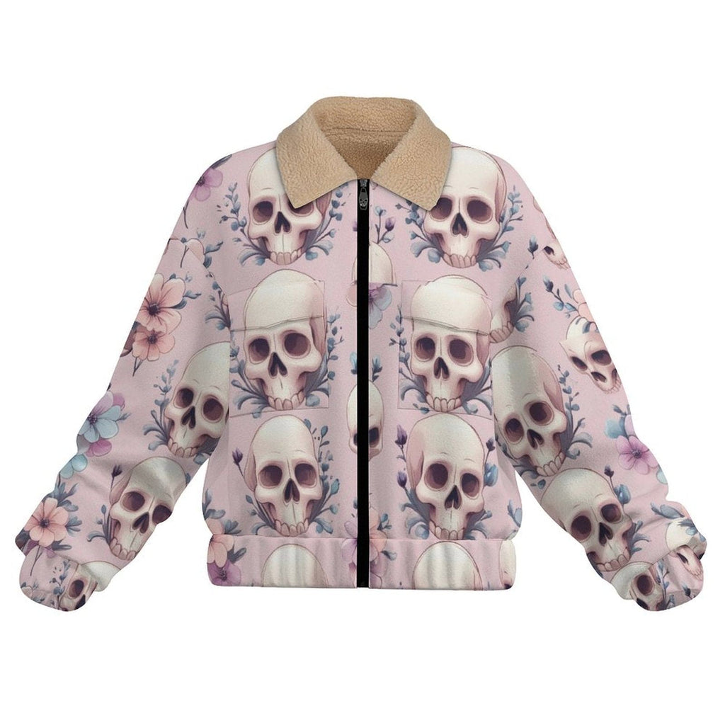 Women's Soft Pastel Floral Skull Patch Pocket Fleece Jacket