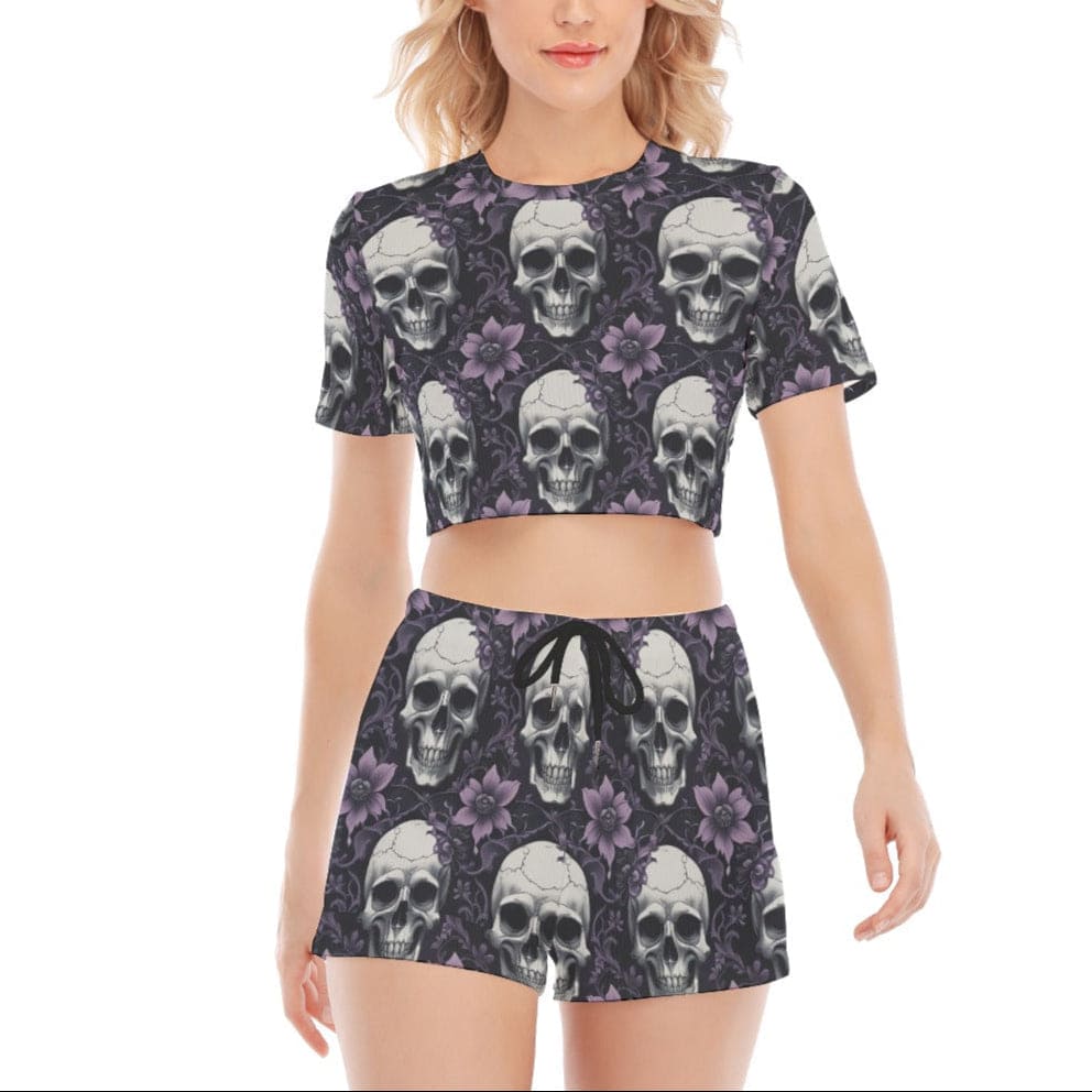 Women's Purple Skulls Floral O-neck T-shirt & Shorts Set