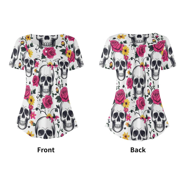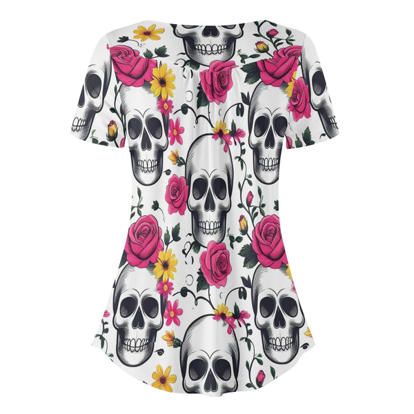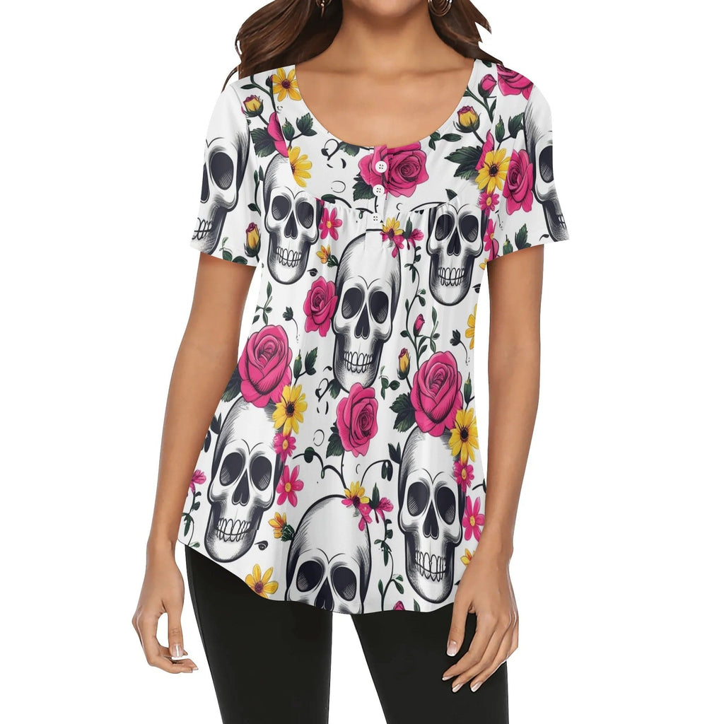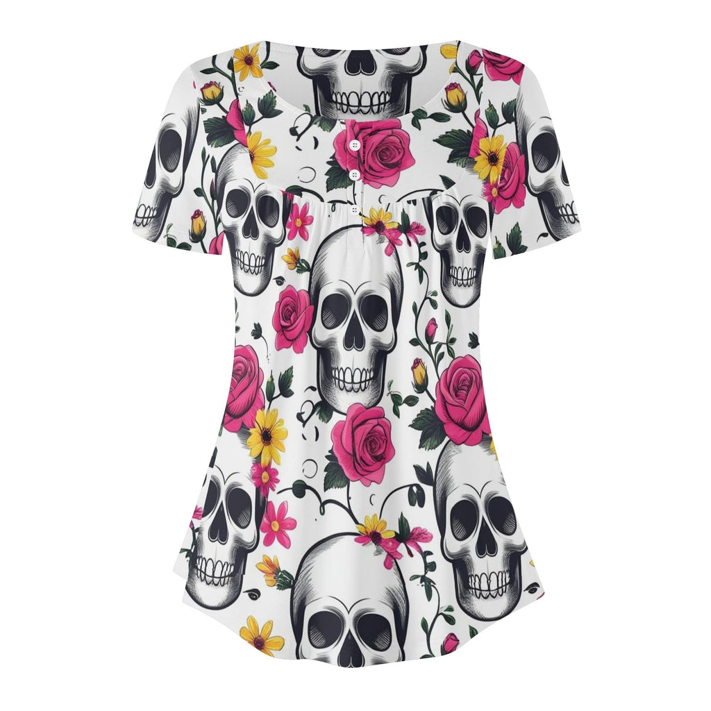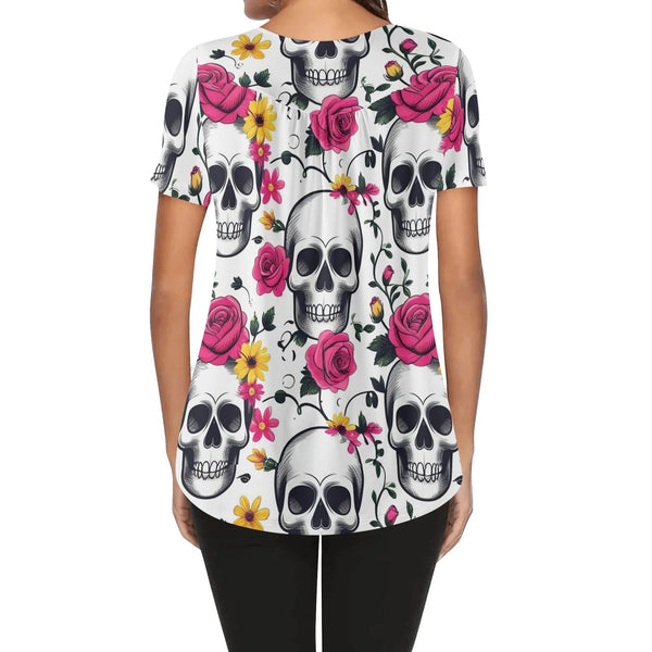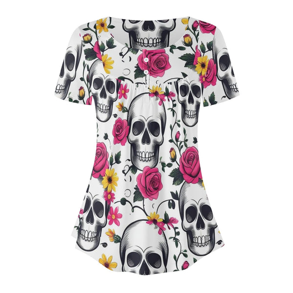 Womens Skulls Pink Roses & Yellow Daisies Short Sleeve Loose Blouse