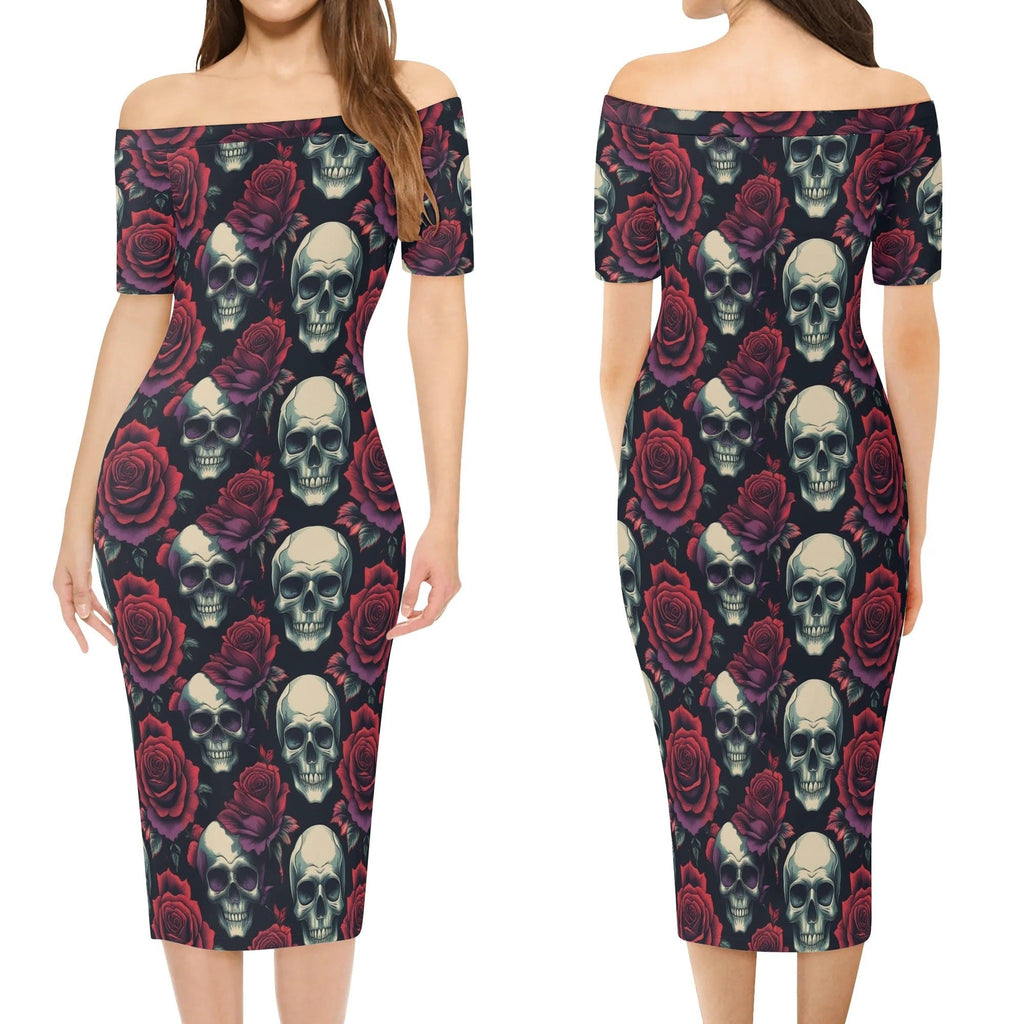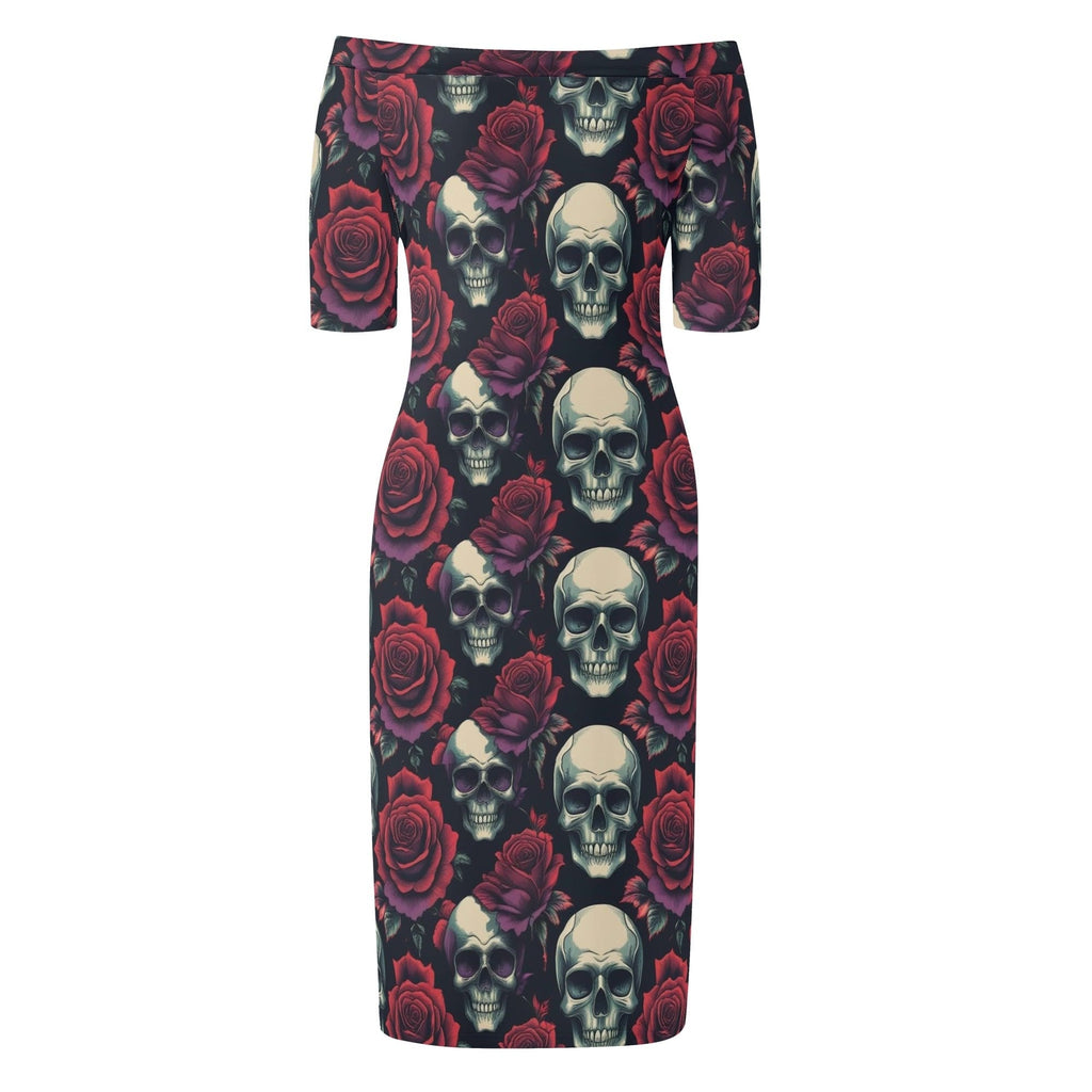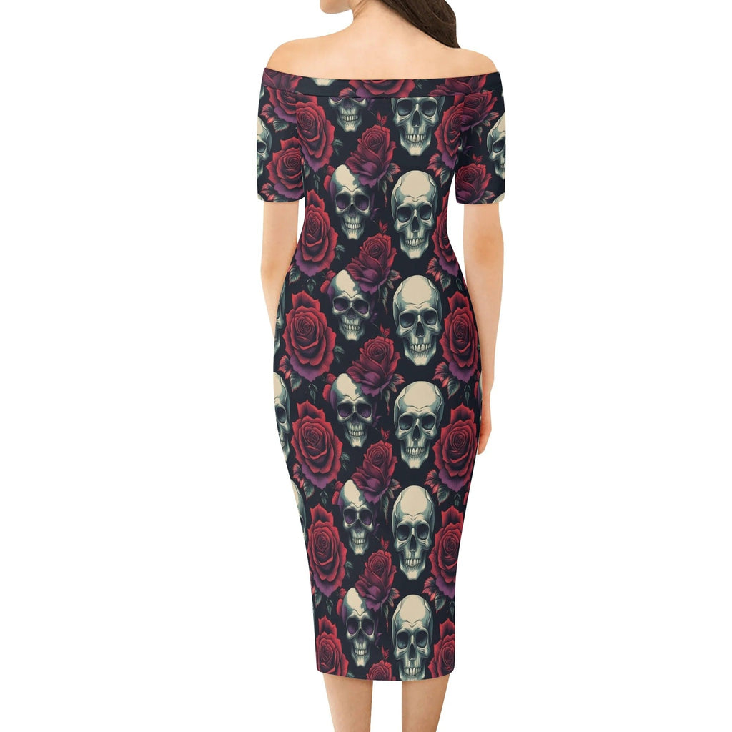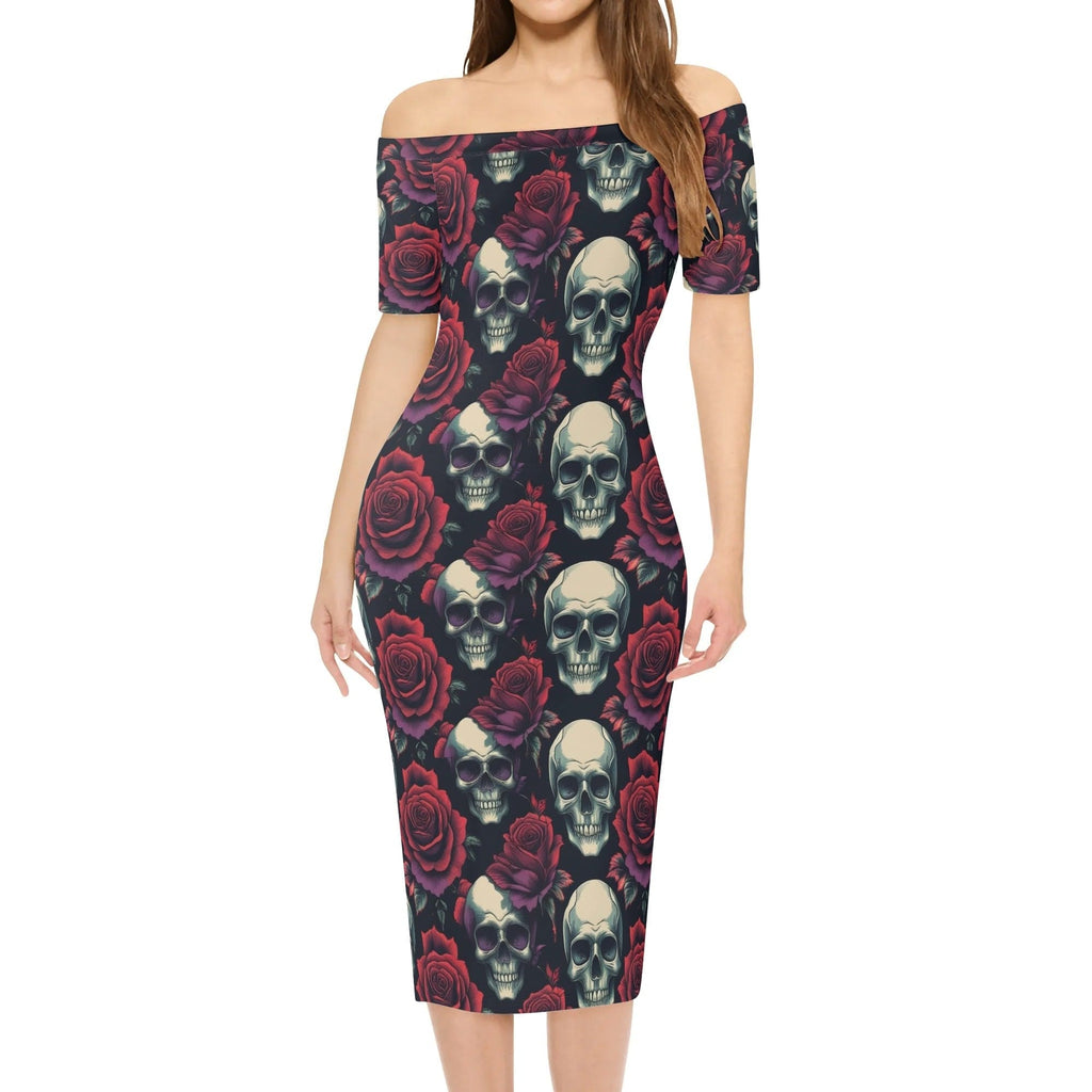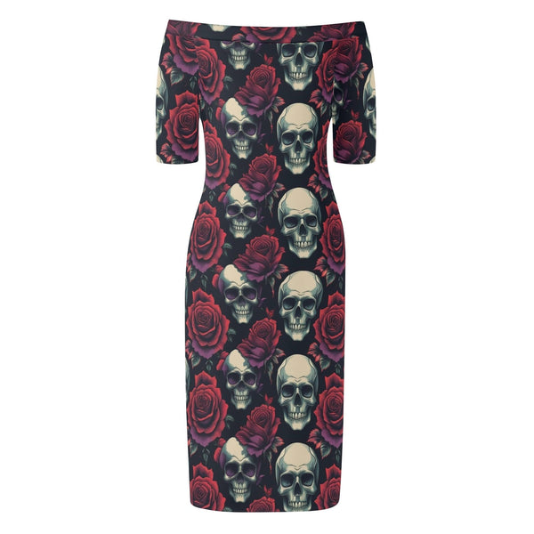 Womens Skulls & Red Roses Off The Shoulder Short Sleeve Elegant Wrap Dress