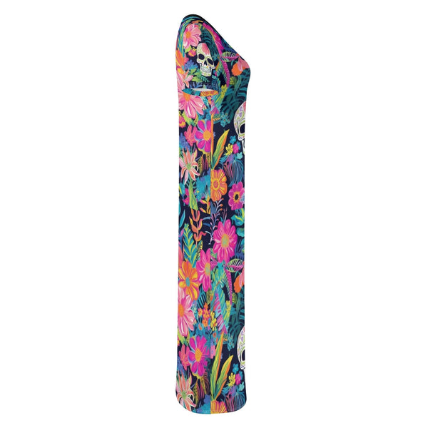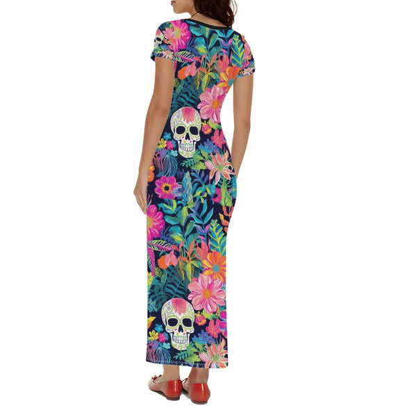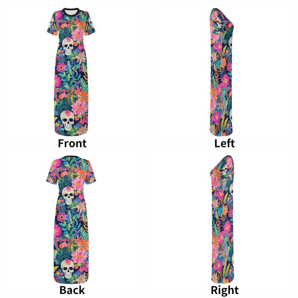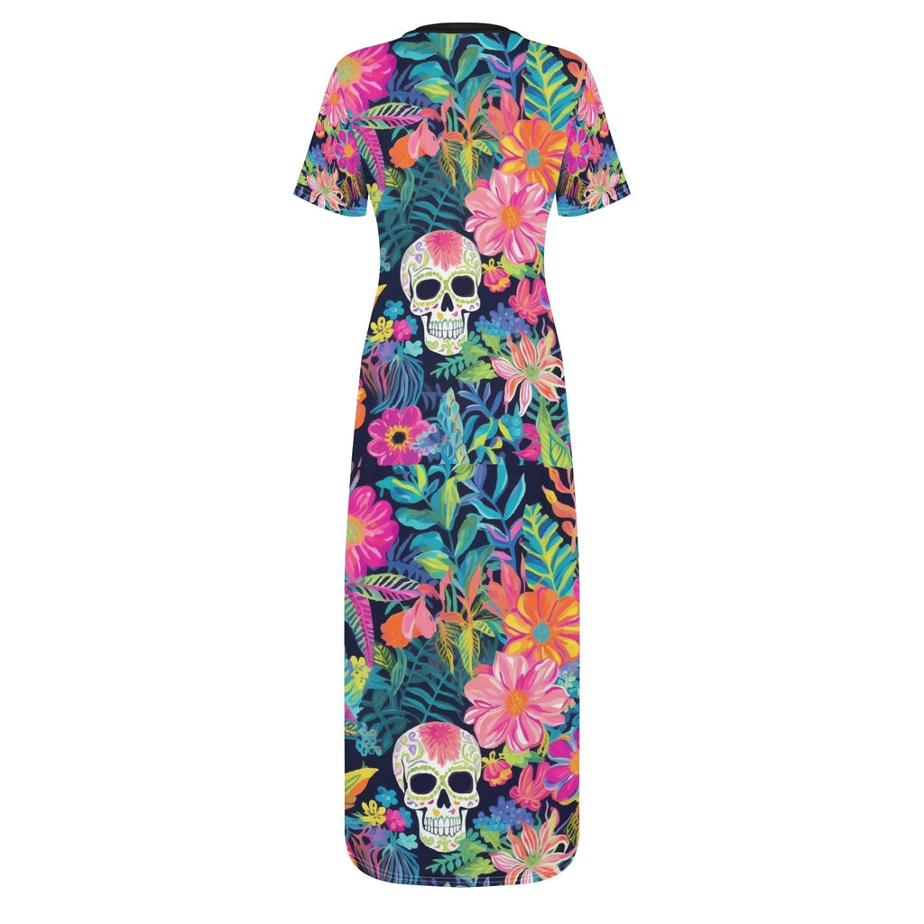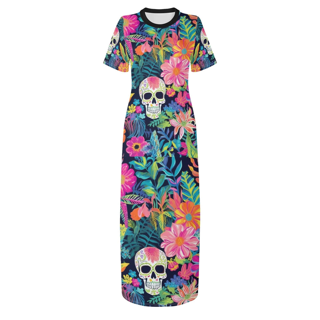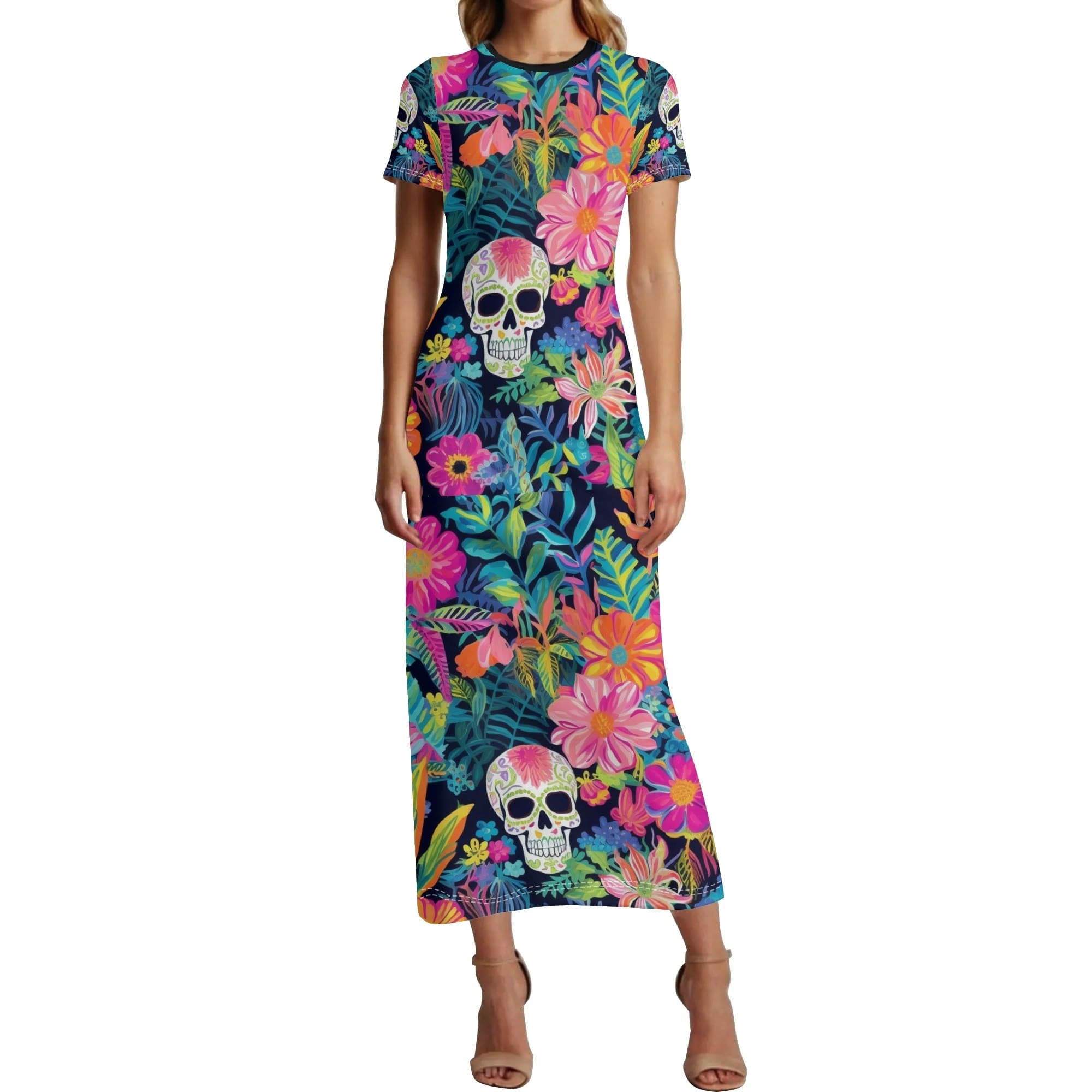 Womens Tropical Floral Skulls Short Sleeve Casual Long Dress