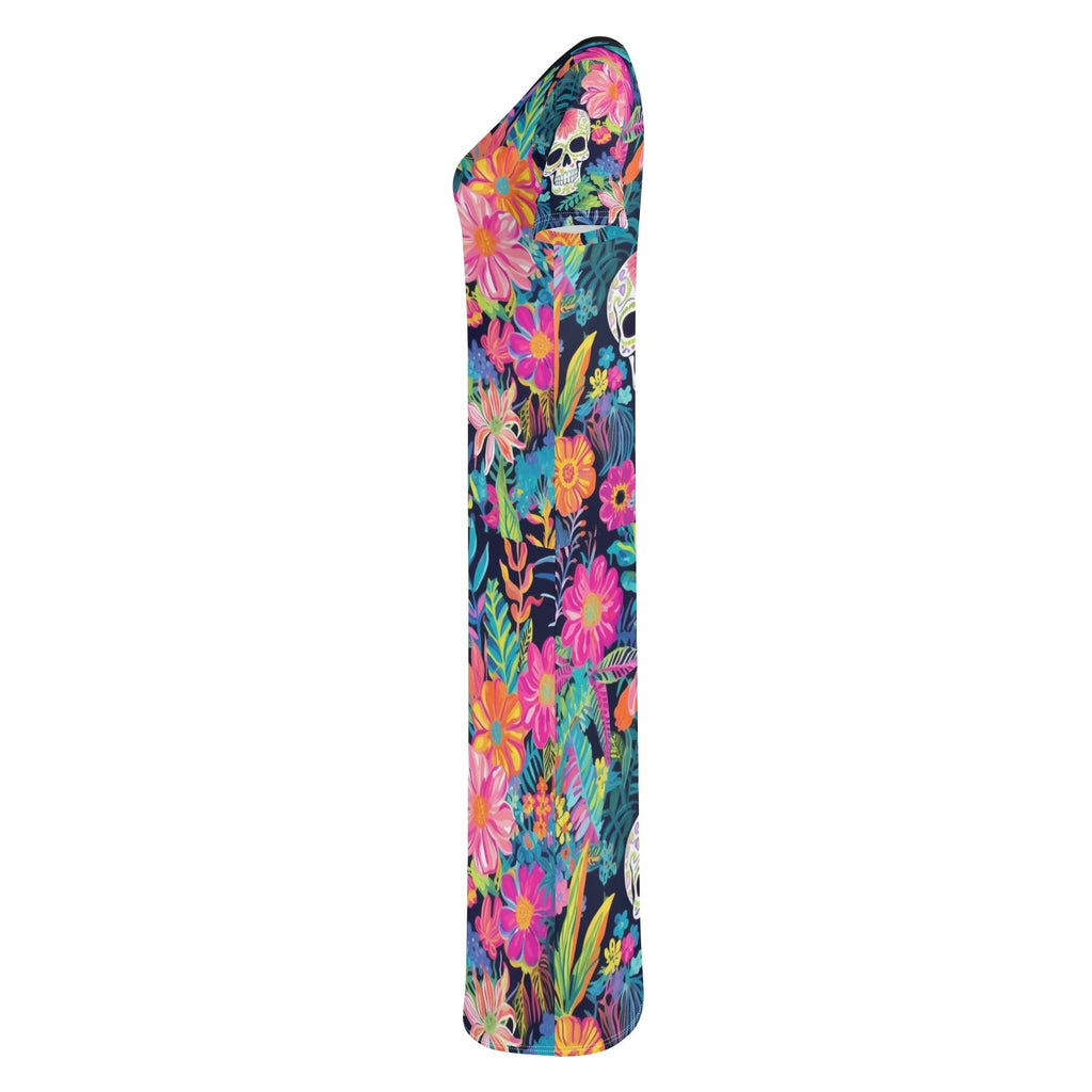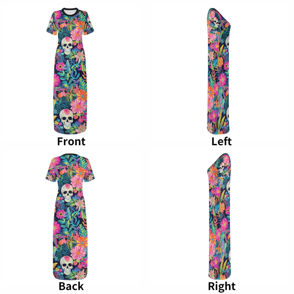 Women's Tropical Floral Skulls Short Sleeve Casual Long Dress